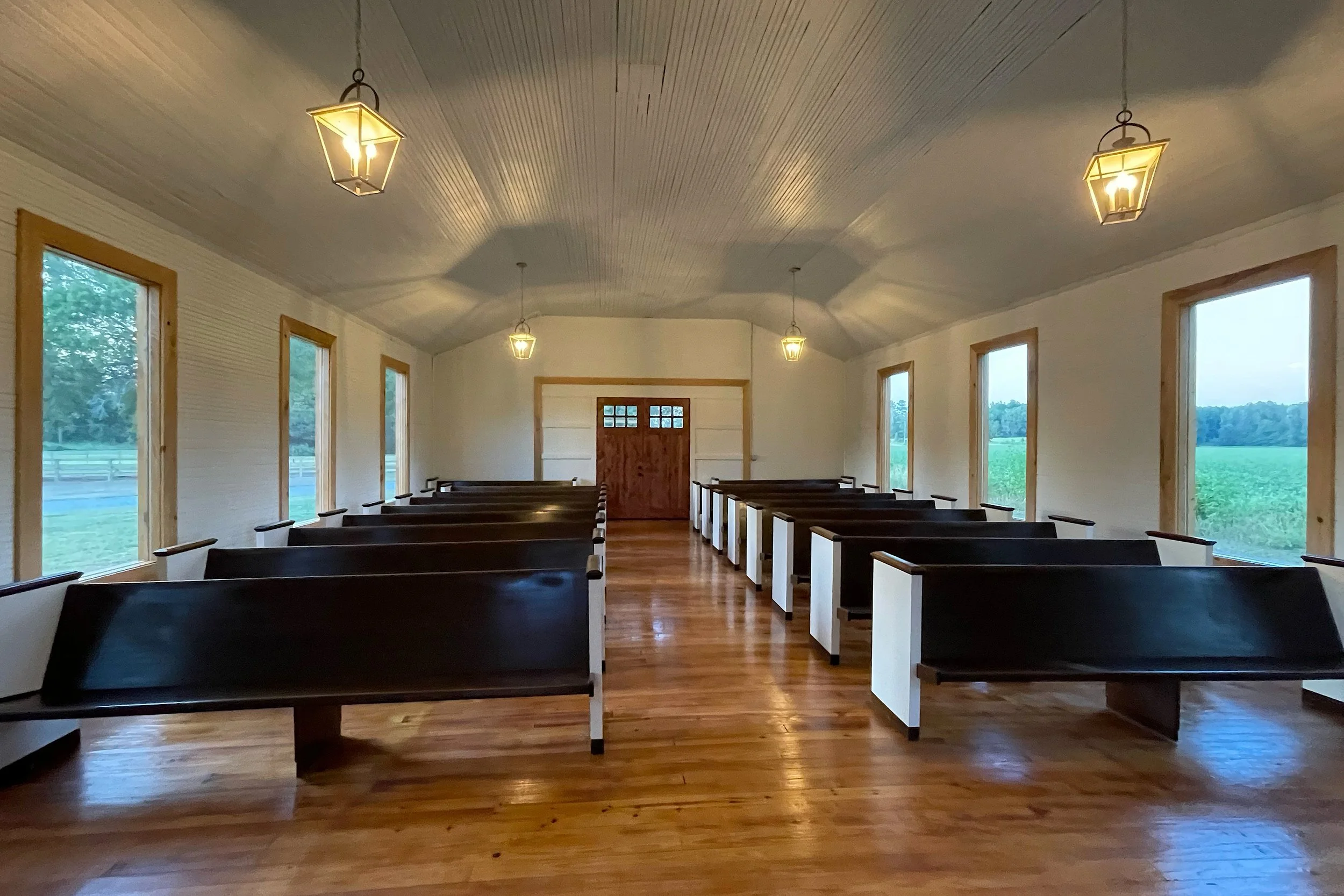 The charming historic Hopewell Chapel, dating back to the 1800s, has been completely renovated and is now ready to host your beautiful and memorable ceremony. Inside, the Chapel accommodates approximately 100 guests. For outdoor weddings, we can provide seating in front of the chapel or elsewhere on the property for up to 200 guests. Whether you’re planning a wedding, vow renewal, or any other special event, the Hopewell Chapel offers an unforgettable setting. With its original heart pine floors and historic character, it adds a unique and elegant touch to your celebration. It’s also the perfect place for capturing stunning photos, both inside and out.